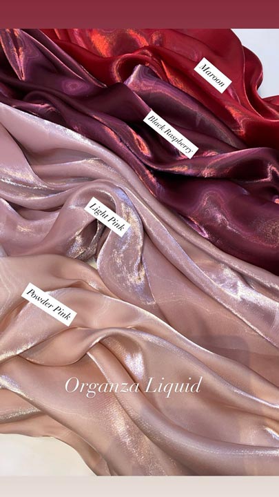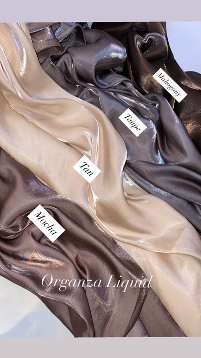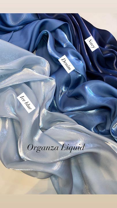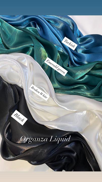 Organza liquid adalah jenis kain organza yang memiliki kilau lebih tinggi dan tampilan yang lebih mengalir atau seperti cairan, seringkali karena terbuat dari serat poliester yang diproses khusus untuk mendapatkan efek berkilau dan halus menyerupai satin namun dengan tekstur yang tetap ringan dan transparan