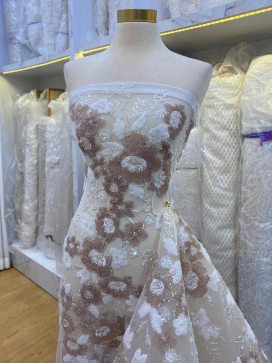Tile flower 3D adalah kain jenis tile (tulle) dengan aplikasi bordir bunga yang memiliki tekstur timbul (3D) dan seringkali dikombinasikan dengan payet, memberikan tampilan mewah dan elegan.
